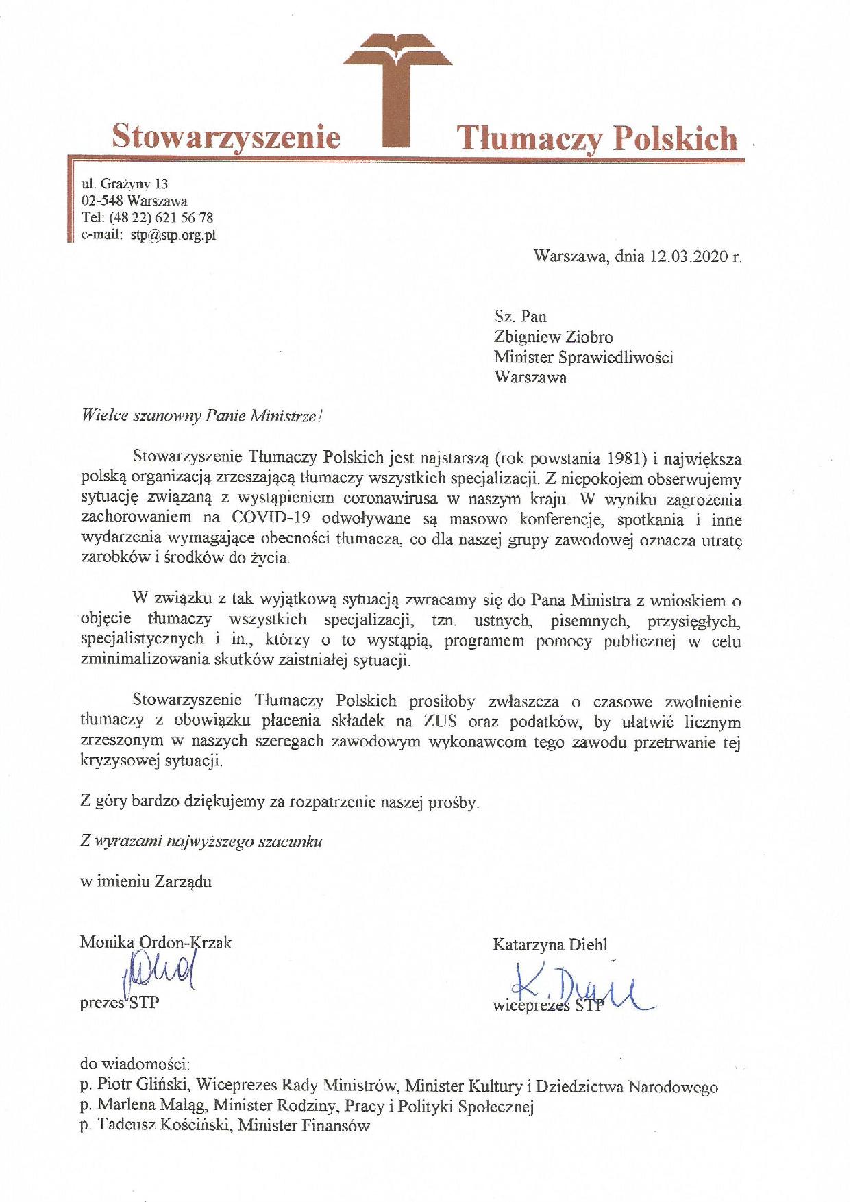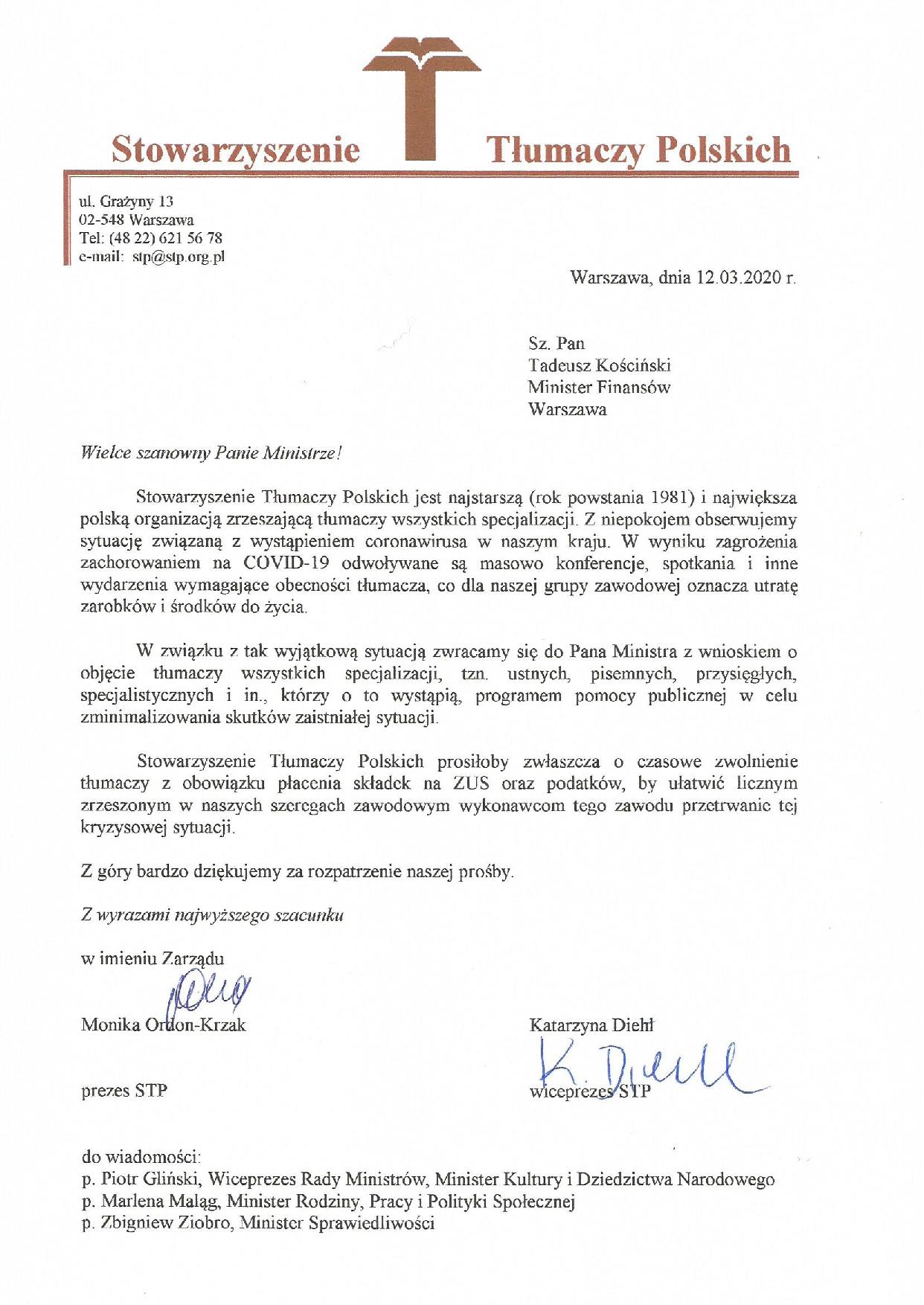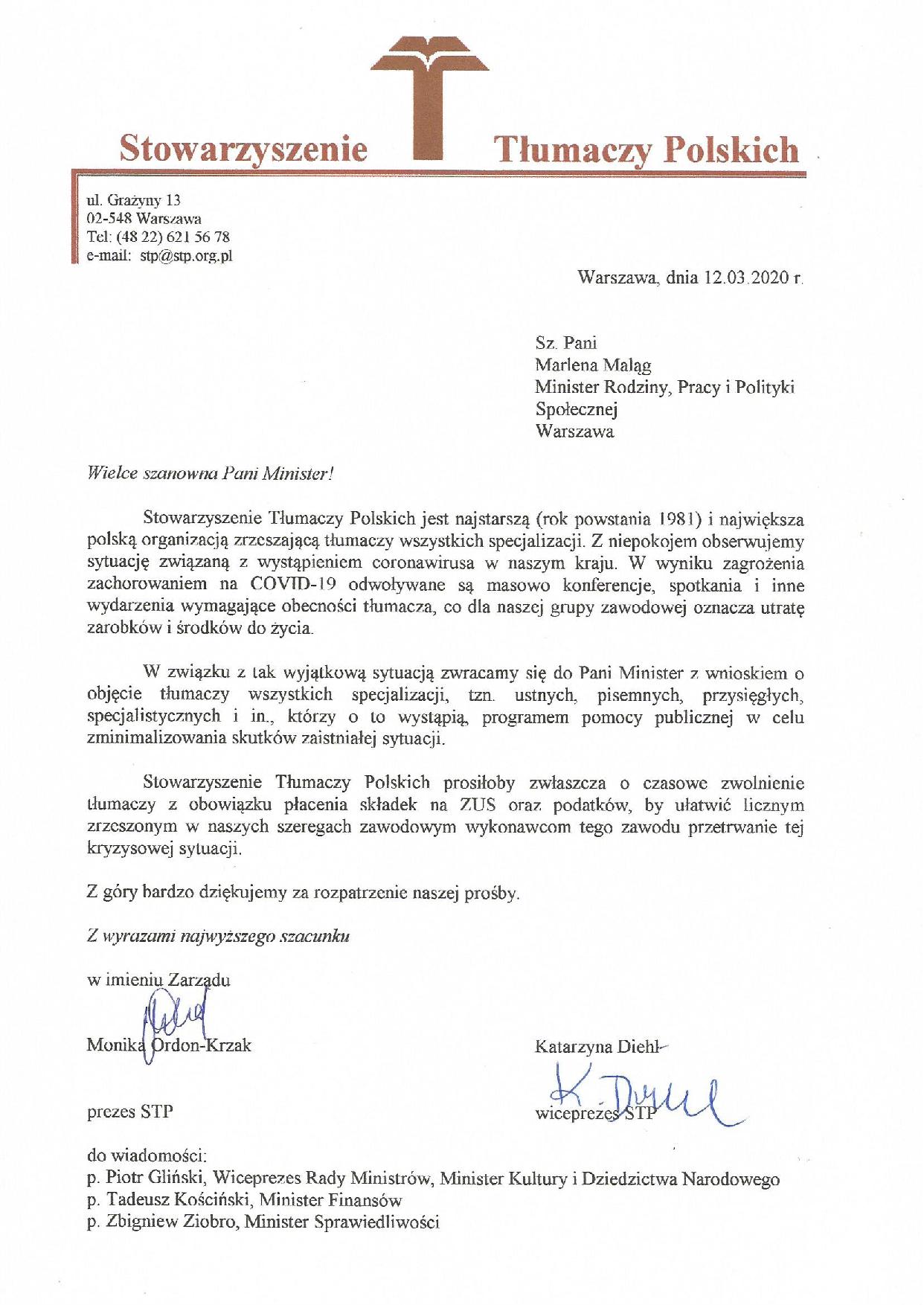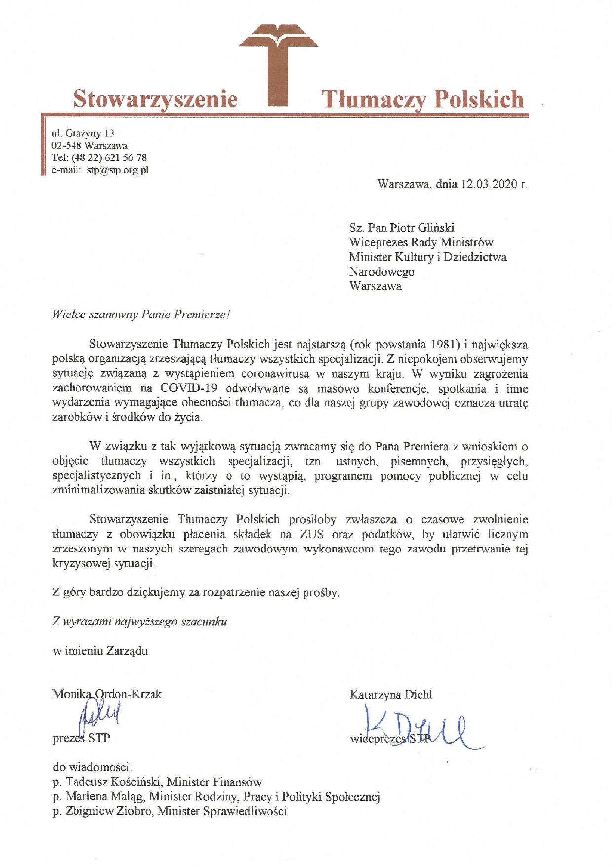 PISMO STP DO PREMIERA MATEUSZA MORAWIECKIEGO I MINISTRÓW RZĄDU RP Zarząd STP skierował do pana premiera Mateusza Morawieckiego i ministrów rządu RP pisma ws. złagodzenia skutków epidemii dla tłumaczy.